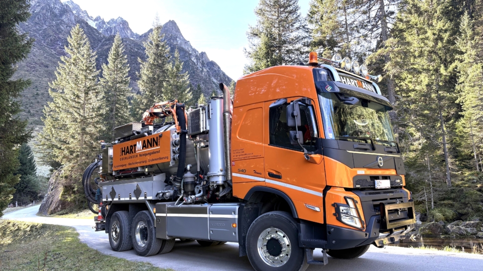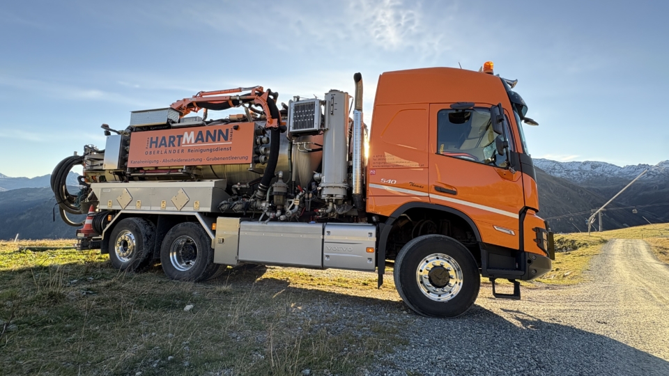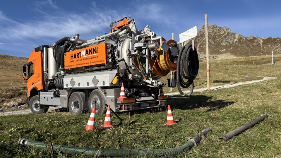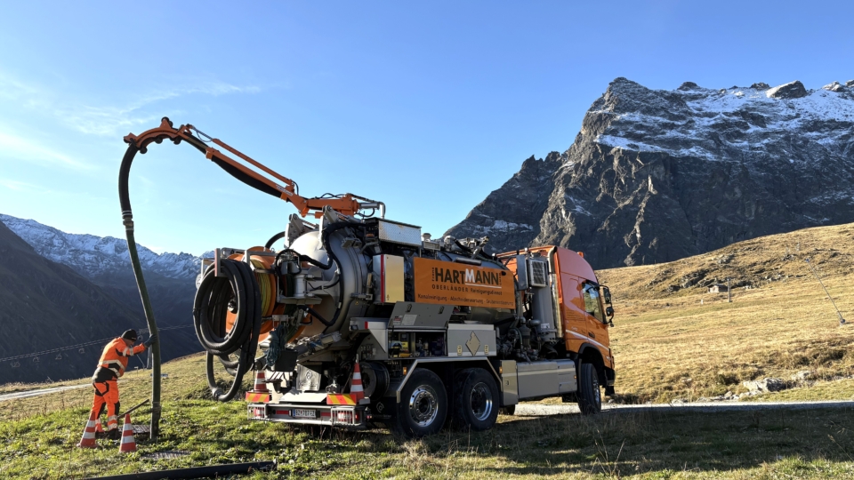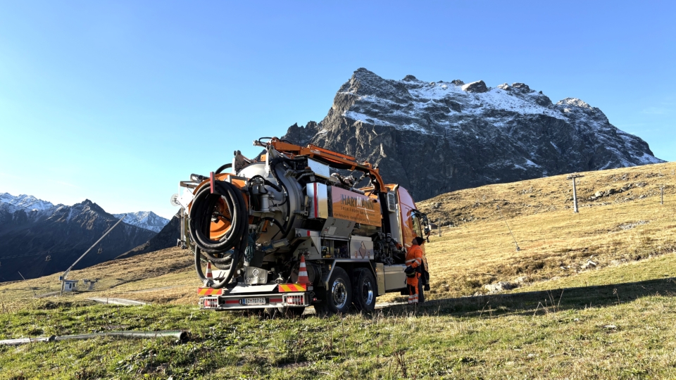 De werkdag begon om 7 uur ’s ochtends op het hoofdkantoor in Ludesch. Van daaruit vertrokken we samen met de DIAMO Combi naar Hochmontafon – onze bestemming was een locatie op ongeveer 2.000 meter hoogte. Op het programma stond het legen en spoelen van een vetafscheider bij een bergrestaurant dat zowel in de zomer als in de winter geopend is.
